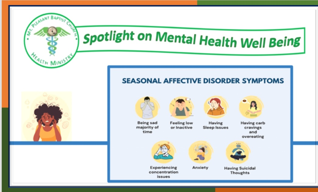 The Mental Health topic presented this week is Seasonal Affective Disorder Symptoms. Information will be available each Sunday after service on topics such as Seasonal Effective Disorder, Depressions, Anxiety/Stress, Suicide, Grief and Self Care.