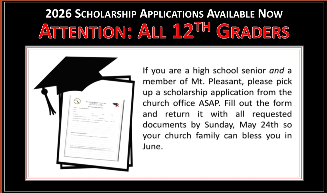 If you are a high school senior and a member of Mt. Pleasant, please pick up a scholarship application from the church office ASAP. Please return the form with all documentation by