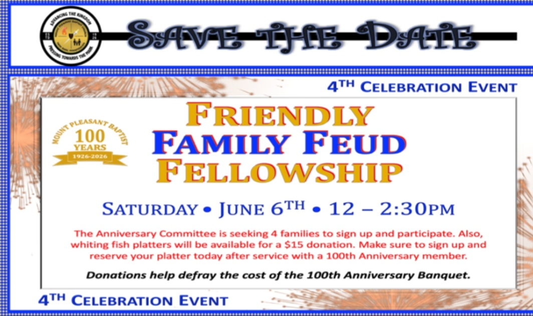 The Anniversary Committee is seeking 4 families to sign up and participate. Also, whiting fish platters will be available for a $15 donation. Sign up and reserve your platter after morning worship service.