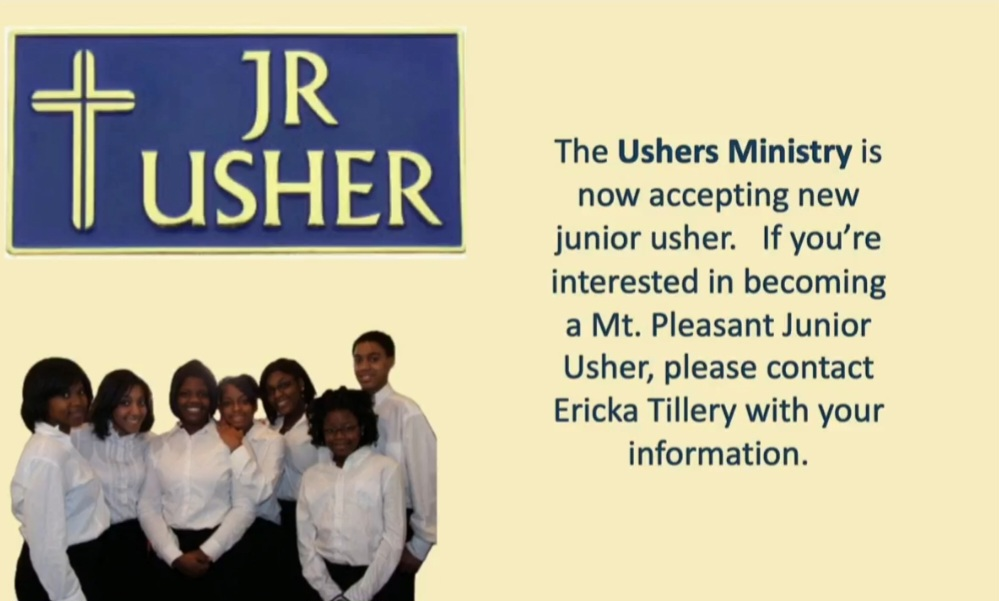 The Ushers Ministry is now accepting New Junior Ushers. If you are interested in becoming a Mt. Pleasant Junior Usher, please contact Ericka Tillery with your information.